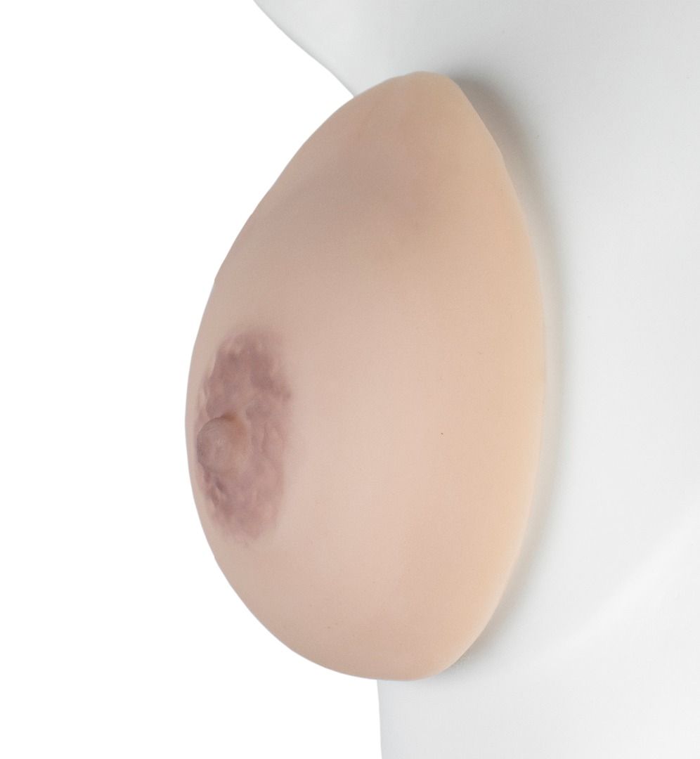Имитатор молочной железы, выполненный из очень мягкого материала, имитирующего биологическую ткань. Используют с поддерживающим корсетом (бюстгальтером) для косметических целей или в ролевых играх. Токсикологически безопасен, гипоаллергенен ,т.к. в качестве наполнителя-пластификатора используется медицинское вазелиновое масло. Первый размер.