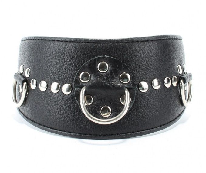 Чёрный кожаный ошейник с полукольцами и клёпками.