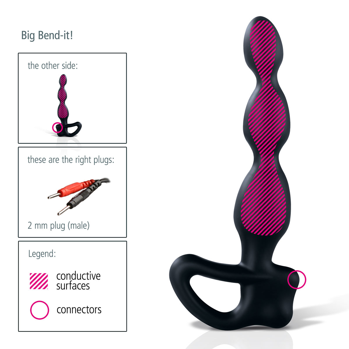 Big Bend-it – стимулятор простаты, сделанный из гипоаллергенного силикона с добавлением платины. Если подключить его к электростимулятору MyStim, он порадует не только чувственным проникновением в анус и непревзойдённым скольжением, но и кое-чем другим. Покалывающие ощущения, нарастающие до бешеной пульсации…это что-то невероятное! Благодаря технологии Flex & Stay стимулятор из 3 сросшихся овалов можно сгибать – он сохранит форму даже при интенсивном массаже простаты. Длина - 18 см. Диаметр - 1,5-4,4 см.