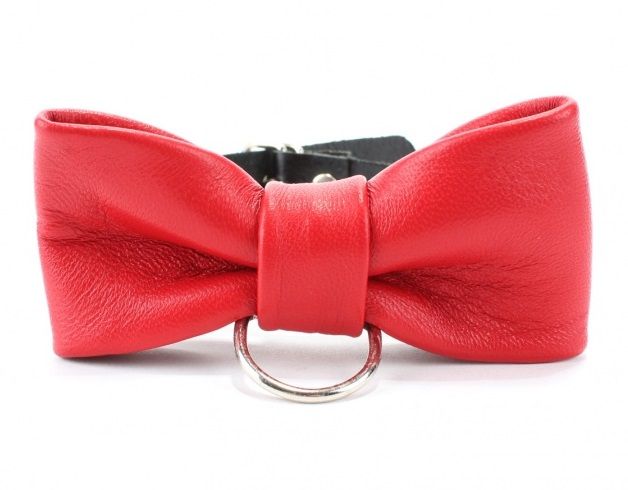 Черный ошейник с красной бабочкой идеально подойдет как для мужчин, так и для женщин. В ошейник вставлено D-кольцо, с которым фетиш-изделие соединяется с бандажом или поводком. Ширина ошейника - 1,5 см., бабочки - 6 см.